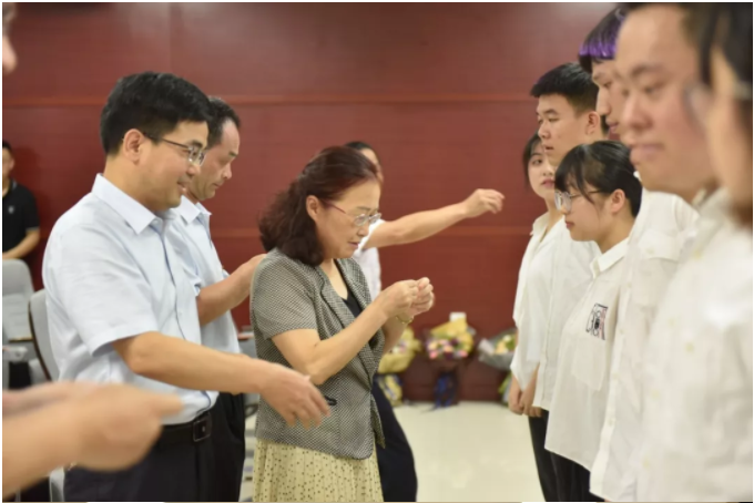 公司全体党委委员为新入党的同志代表佩戴党徽。
