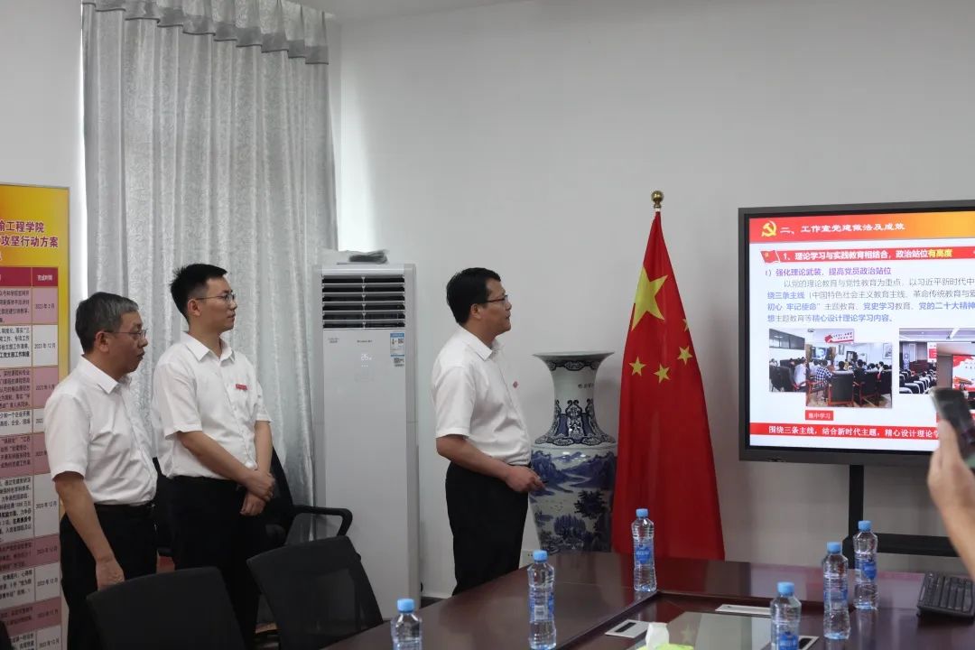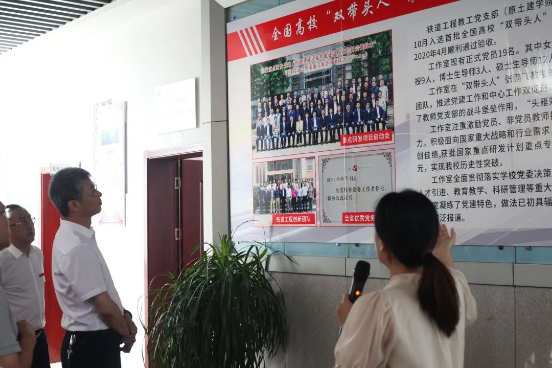 公司办公楼三楼楼梯口是铁道工程教工党支部(原土建公司教工第二党支部)的首批全国高校“双带头人”教师党支部书记工作室简介。该工作室2018年10月成功入选,2022年4月顺利通过验收。参会人员来到工作室观摩,全国“双带头人”教师党支部书记工作室负责人张鹏飞教授介绍基本情况。与会嘉宾还同时观摩了铁道工程教工党支部的《学科党建示范攻坚行动方案暨责任清单》。