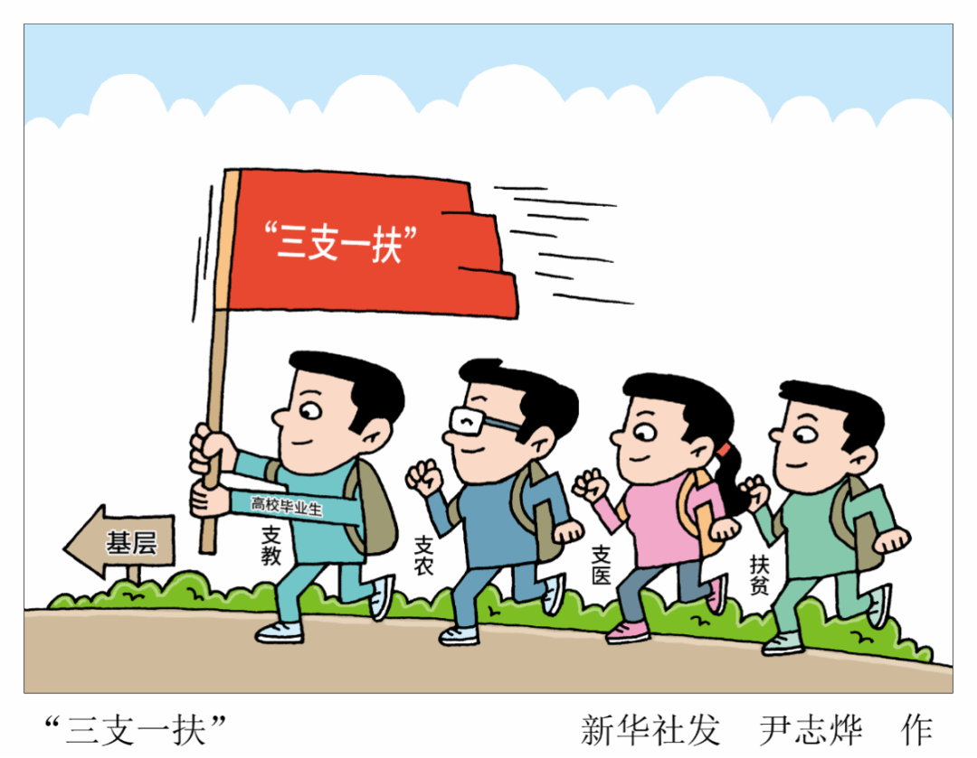 “三支一扶”是支教、支医、支农、扶贫的简称,每年招募1.8万名毕业生,服务西部1-3年。