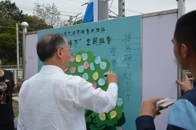 “撸起袖子好好学,梦想成真”是万书记在“畅想树”上写下的对同学们的寄寓,随后万明对在座同学提出了进一步的期望与建议,同学们也在“畅想树”上写下了自己的“小目标”。班会最后,全体与会人员于基地前合影留念。此次班会,不仅真正的做到了畅谈青春的目的,同时也拉近了同学与老师、同学与同学间的关系,整个班会氛围融洽温馨,但也同样卓有成效,相信同学们会在以后的日子里百尺竿头,更进一步。