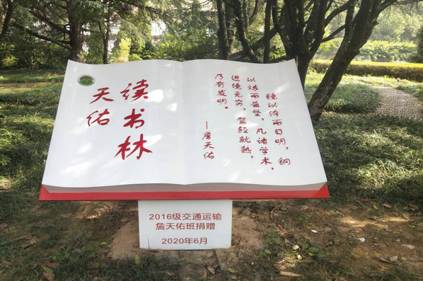 詹天佑雕像后,运输办公楼前,一块幽静的树林,最近悄然新增了一块由毕业班级2016级交通运输詹天佑班集体捐赠的雕塑,成了北区学子晨读和思想交流的好去处。