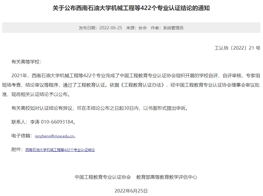 近日,中国工程教育专业认证协会发布《关于公布西南石油大学机械工程等422个专业认证结论的通知》(工认协〔2022〕21 号)(https://www.ceeaa.org.cn/gcjyzyrzxh/xwdt/tzgg56/630518/index.html)。公司交通工程、测绘工程专业名列其中,认证有效期为6年(2022年1月至2027年12月)。这标志着公司交通工程、测绘工程专业的人才培养质量实现了国际实质等效,进入全球工程教育的“第一方阵”。