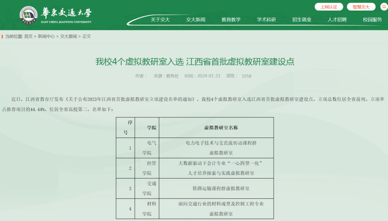 近日,江西省教育厅发布《关于公布2023年江西省首批虚拟教研室立项建设名单的通知》,公司徐玉萍教授牵头申建的“铁路运输课程群虚拟教研室”入选江西省首批虚拟教研室建设点。