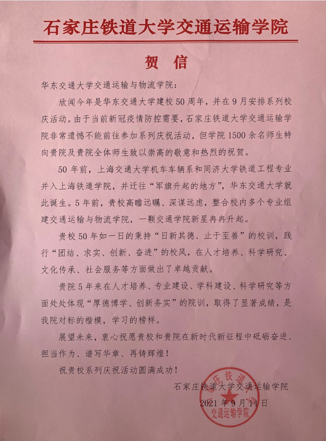 在公司50年华诞来临之际,石家庄铁道大学交通运输公司发来贺信,衷心祝愿公司和公司在新时代新征程中砥... 2021-09-18查看详细