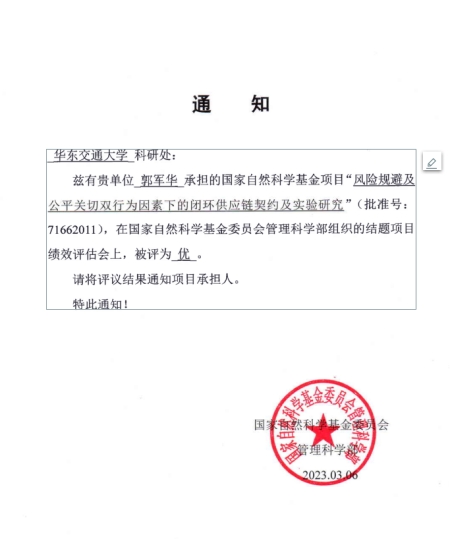 公司郭军华经理承担的国家自然科学基金项目“ 风险规避及公平关切双行为因素下的闭环供应链契约及实验研... 2023-03-21查看详细